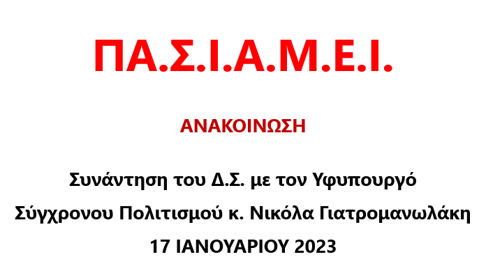 Συνάντηση του ΔΣ του ΠΑ.Σ.Ι.Α.Μ.Ε.Ι. με τον Υφυπουργό ΥΠ.ΠΟ.Α Νικόλα Γιατρομανωλάκη 17/1/23